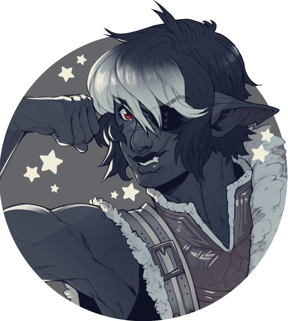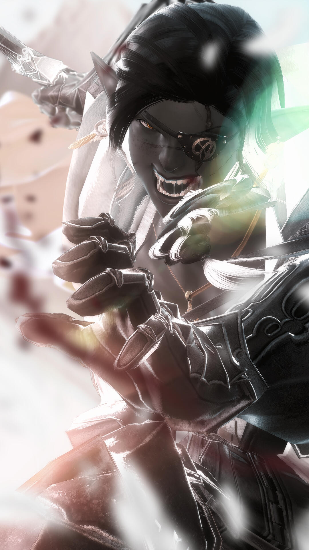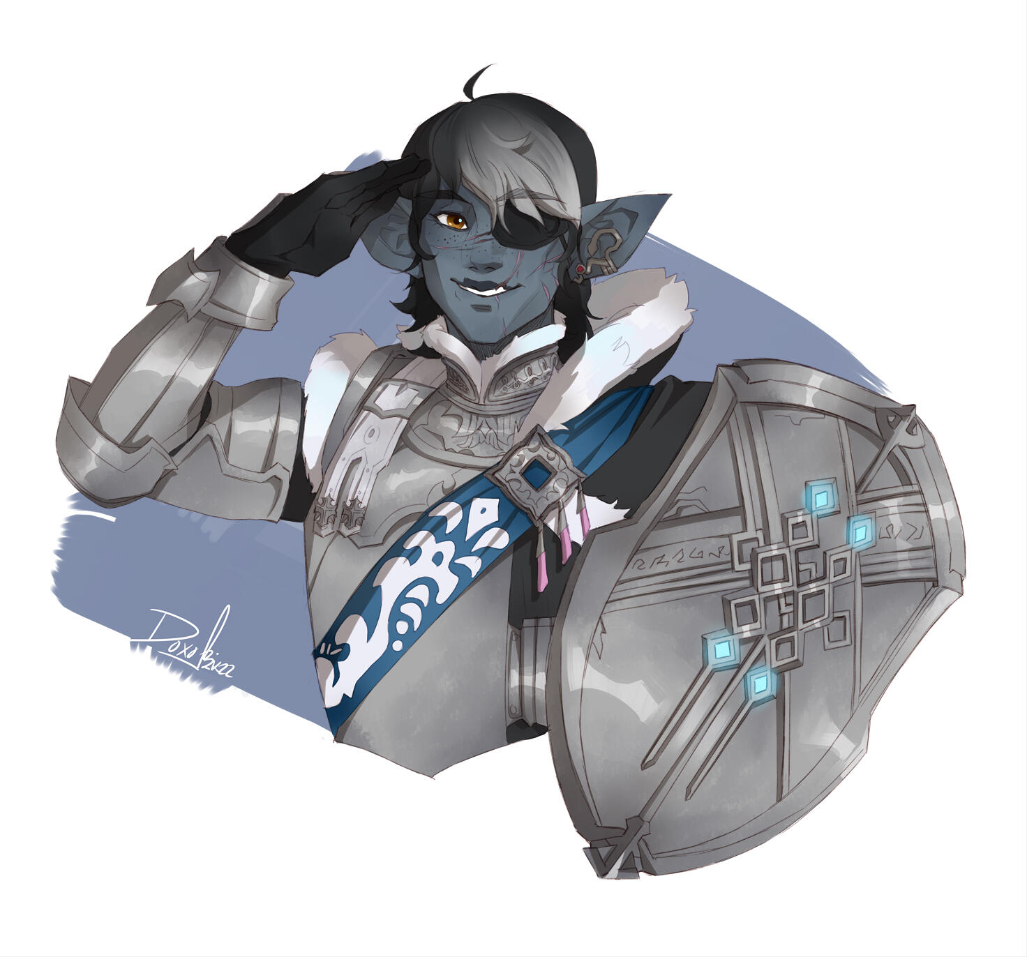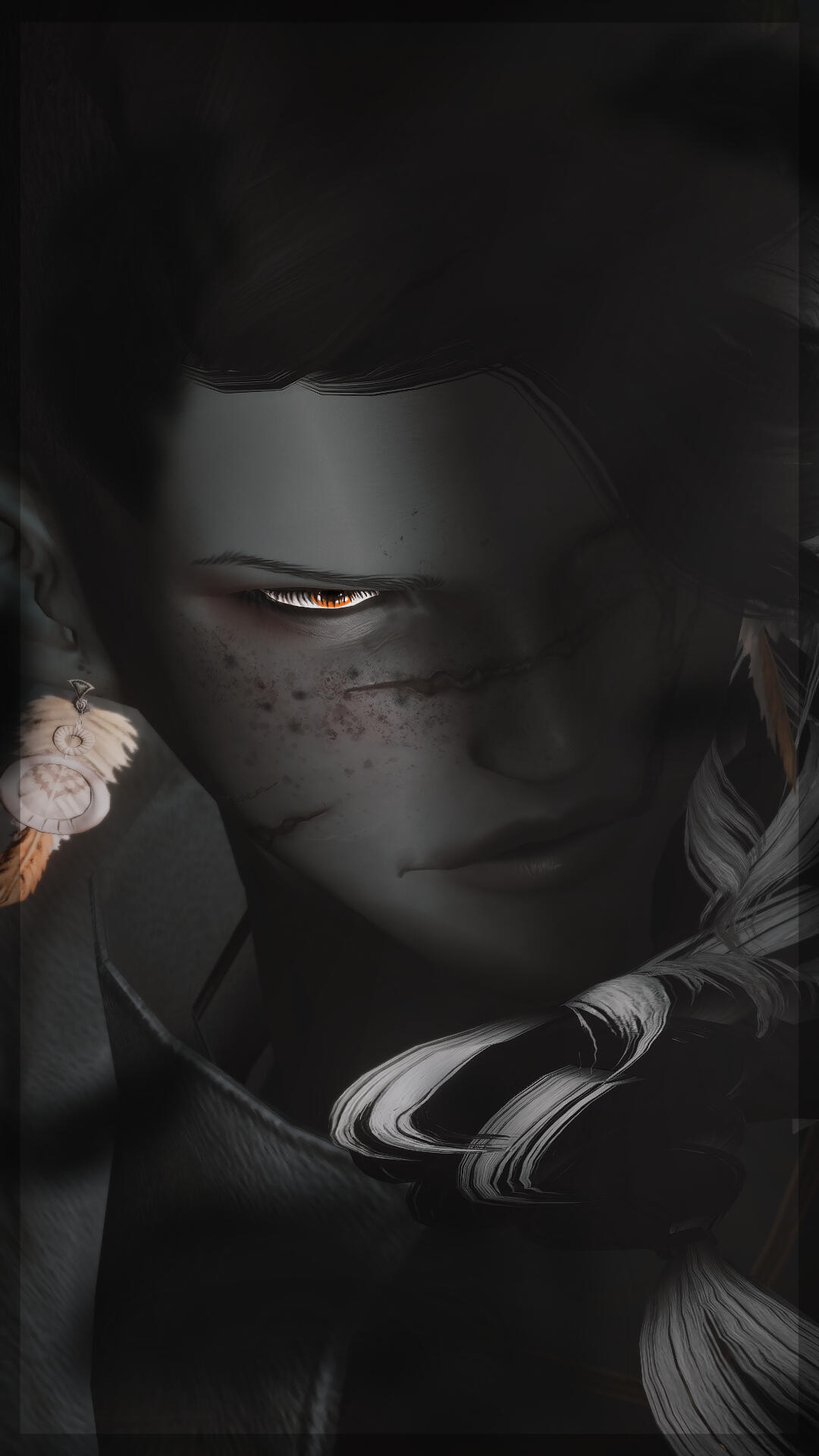 An armor-clad monument of slate-gray skin and magpie-hair, the towering elezen bears the proud posture and confident stride of a trained fighter. Yein Que-Sae, known to some simply as "Sparrow," stands tall and broad.Wide shoulders sit atop a naturally strong build that is only further accentuated by musculature developed over years of labor. Old scars stretch across a wide nose and pronounced lips, mapping injuries severe enough to have damaged and discolored their left eye. Despite their intimidating size and appearance, Yein is typically very polite and friendly to others.Yein is no stranger to the ugliness of the star, and it's physically ravaged them. Even so, they are sworn to preserve and honor the sanctity of all life. To achieve this, they greet the world they have devoted themself to with an open heart. They give their love to others freely, in spite of all their fears and their pain. In combat, they will raise their shield before they draw their sword.