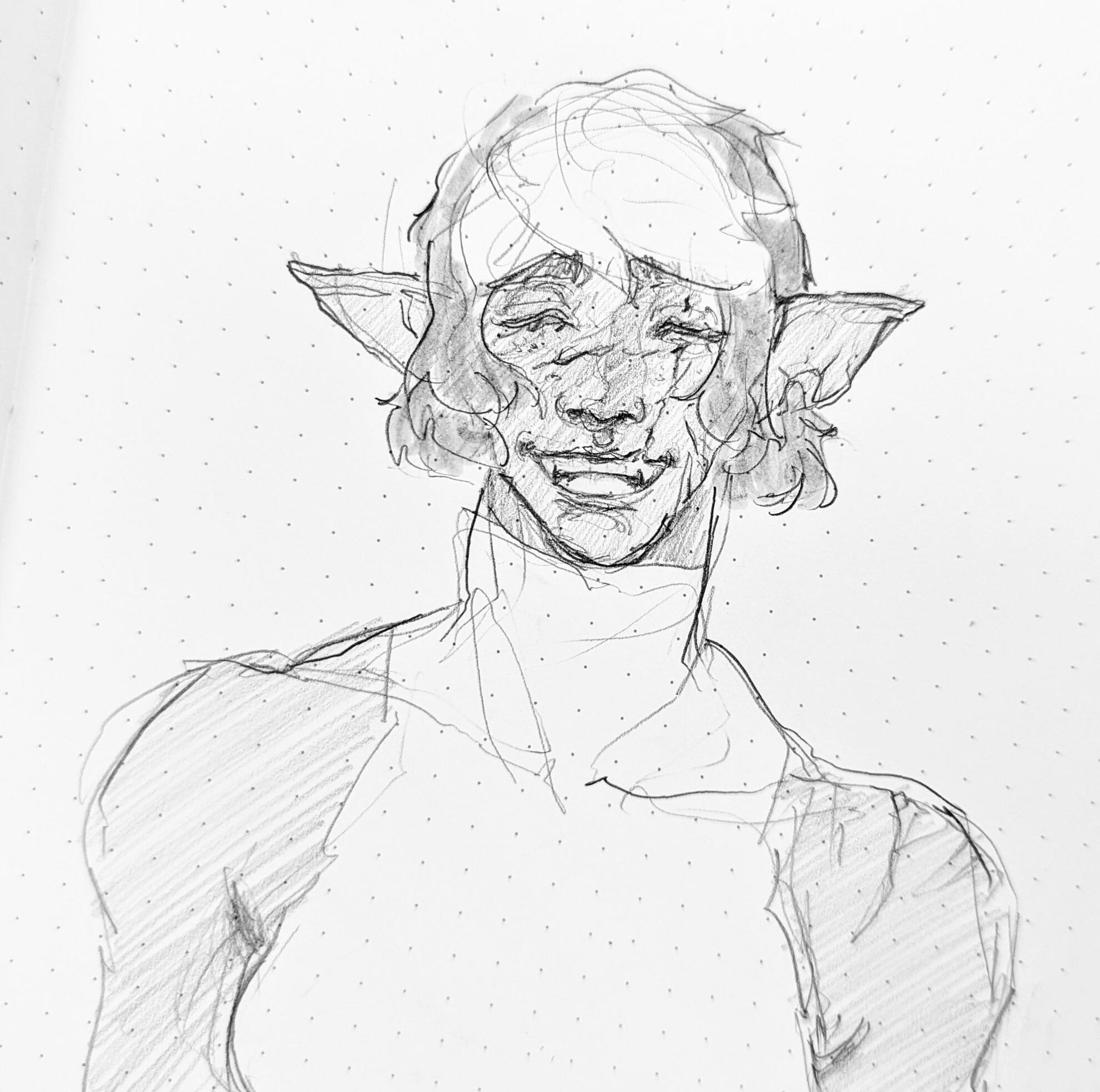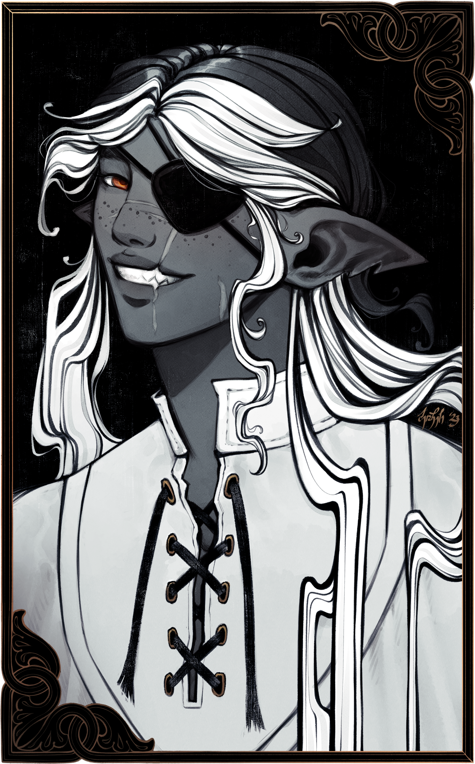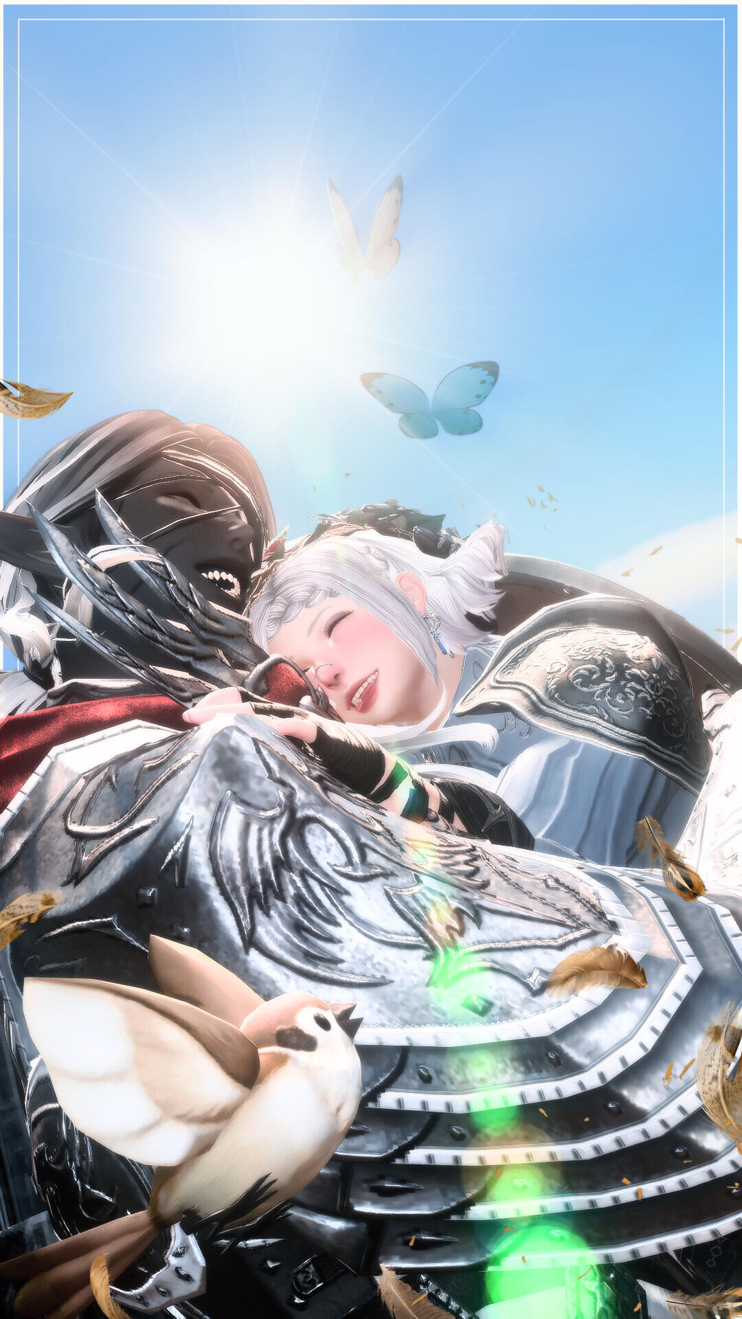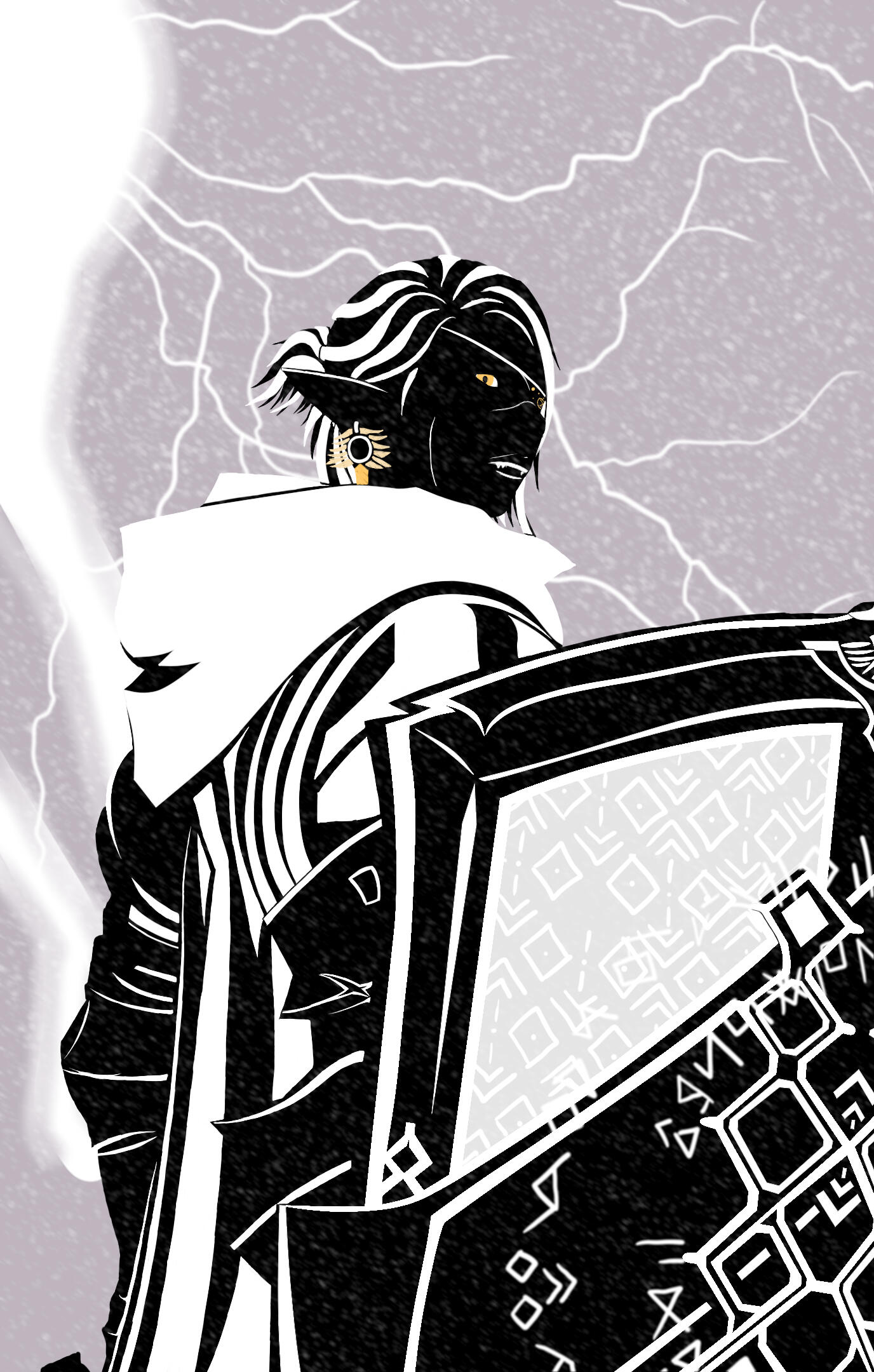 An armor-clad monument of slate-gray skin and magpie-hair, the towering elezen bears the proud posture and confident stride of a trained fighter. Yein Que-Sae, known to some simply as "Sparrow," stands tall and broad.Wide shoulders sit atop a naturally strong build that is only further accentuated by musculature developed over years of labor. Old scars stretch across a wide nose and pronounced lips, mapping injuries severe enough to have damaged and discolored their left eye. Despite their intimidating size and appearance, Yein is typically very polite and friendly to others.Yein is no stranger to the ugliness of the star, and it's physically ravaged them. Even so, they are sworn to preserve and honor the sanctity of all life. To achieve this, they greet the world they have devoted themself to with an open heart. They give their love to others freely, in spite of all their fears and their pain. In combat, they will raise their shield before they draw their sword.