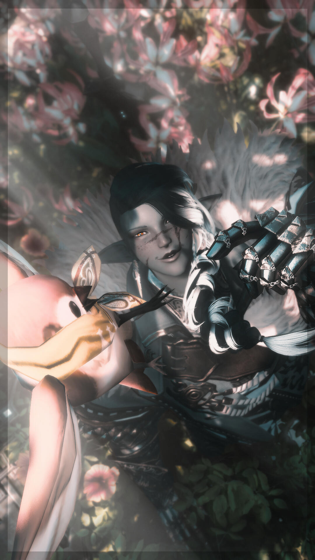 Wandering. Yein has never felt at home anywhere, due to the circumstances of their upbringing. Much of the tragic events that shaped their childhood can be attributed to racial tensions in the Twelveswood. They eventually settled in Ul'dah with a partner, and Yein remained there for a time following his abandonment, attempting to carve a life for themself. At present, they appear to have relocated to the Black Shroud.Sight. Yein has learned to embrace Death as a constant companion throughout their life. This extra sense that facilitates communing with the dead is a trait that runs in the Duskwight's lineage.Others gifted with similar sight might be able to see the spirits that sometimes linger around Yein. Familiar faces are rare, as they tend to prioritize regulars for gentle passage or forced exorcism.Return. Yein's aether is abundant but tainted. Their touch lacks warmth, despite how wild and full their aether appears at a glance. To those with special sight, the paladin's presence might feel mildly unsettling, like peering into a gaping void torn into a once vibrant tapestry.Voice. When they speak, their voice rolls forth in a low, comforting growl -- a gentle rumble reminiscent of smooth river rocks tumbling over each other. Mizu from BLUE EYE SAMURAI is a good approximation.